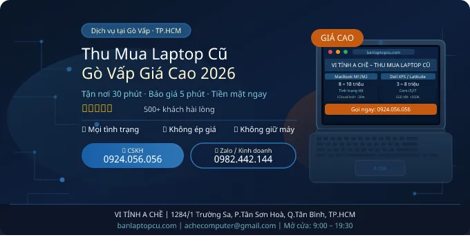Đây là mức giá thu mua laptop cũ Gò Vấp được Vi Tính A Chề áp dụng từ đầu năm 2026. Giá phụ thuộc vào tình trạng thực tế khi kiểm tra trực tiếp.