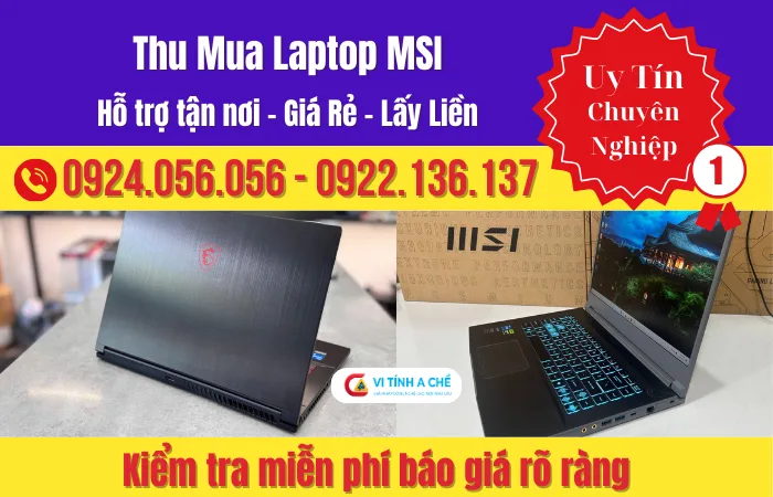 Vi Tính A Chề cung cấp dịch vụ thu mua laptop MSI chuyên nghiệp, kiểm tra trực tiếp trước mặt khách, báo giá minh bạch theo từng thông số kỹ thuật. Khách có thể đến cửa hàng 1284/1 Trường Sa, P.Tân Sơn Hòa, Q.Tân Bình hoặc đặt lịch thu mua tận nơi qua hotline 0924.056.056. Giao dịch diễn ra nhanh – rõ – sạch – không giữ máy.